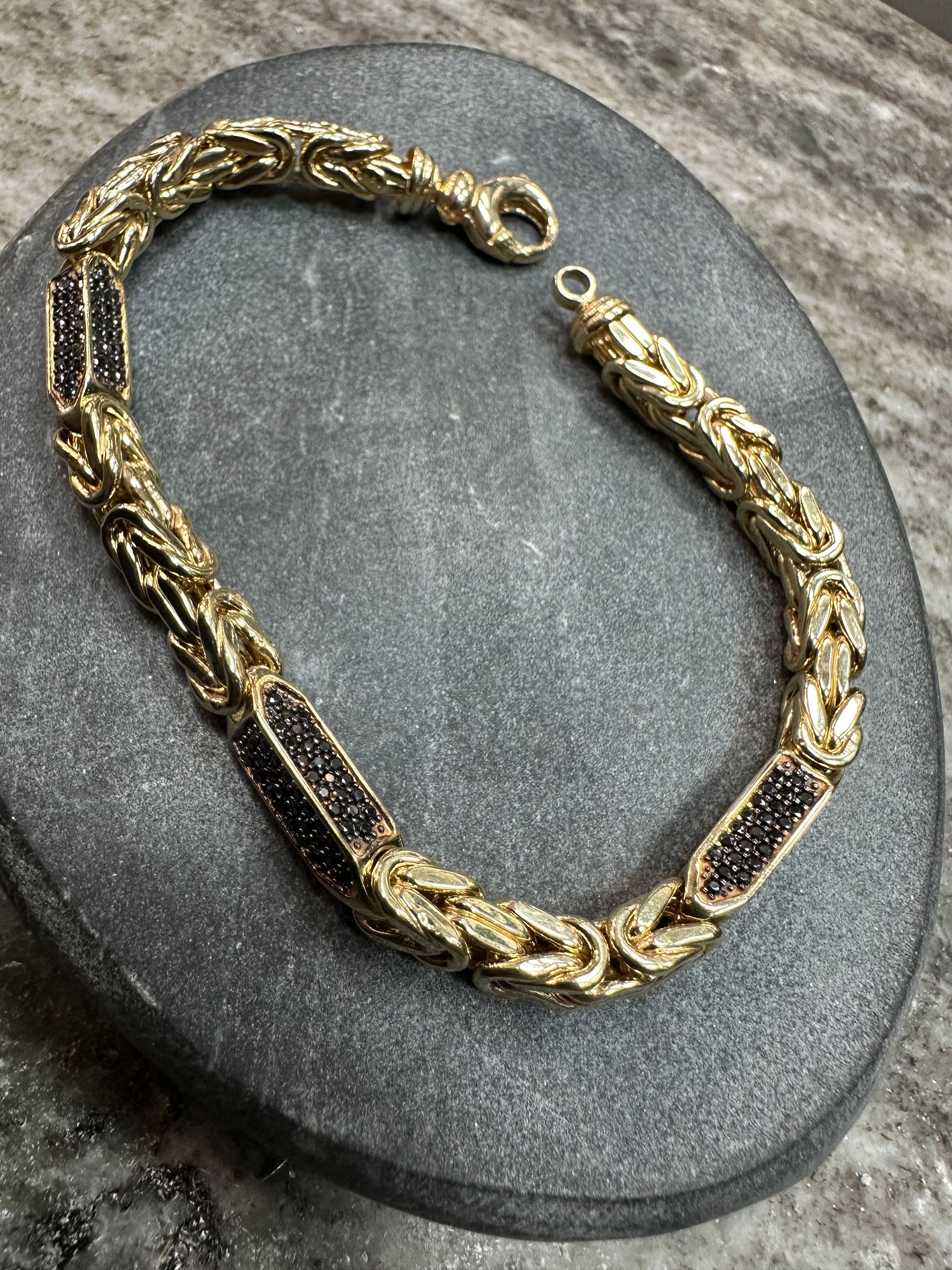 Deze exclusieve 14K gouden koningsset is een toonbeeld van luxe en vakmanschap. De set bestaat uit een ketting van 70 cm en een armband van 22 cm, beide met een royale breedte van 5,5 mm. De klassieke Byzantijnse (konings)schakel straalt kracht, elegantie en tijdloze stijl uit.